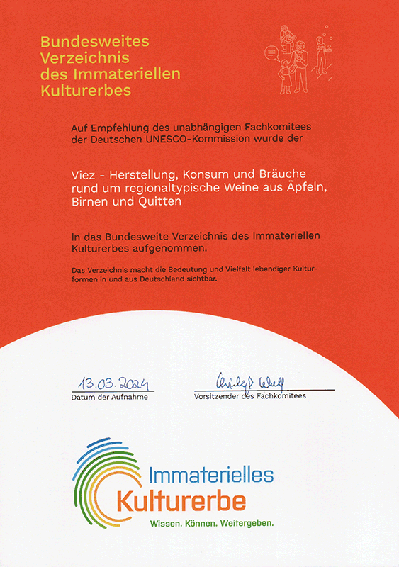 Deutschland ist dem UNESCO-Übereinkommen zur Erhaltung des Immateriellen Kulturerbes 2013 beigetreten. Dieser Schritt ist laut der UNESCO eine Wertschätzung und Anerkennung überlieferten Wissens und Könnens. Ziel ist es, die Vielfalt des lebendigen Erbes zu erhalten, zu pflegen und zu fördern. Im Bundesweiten Verzeichnis des Immateriellen Kulturerbes in Deutschland gibt es bereits 150 Einträge – zu denen nun auch Viez gehört.